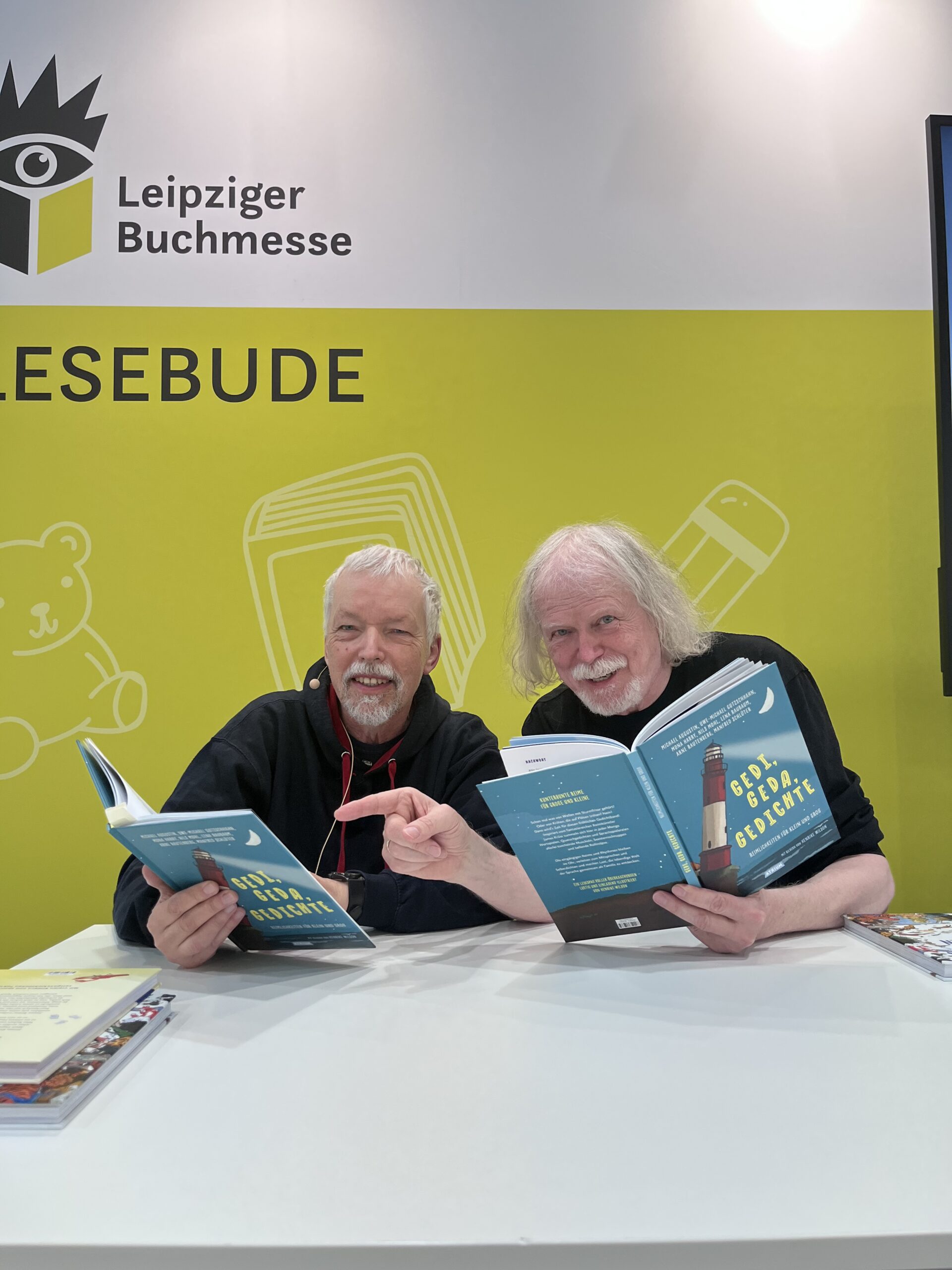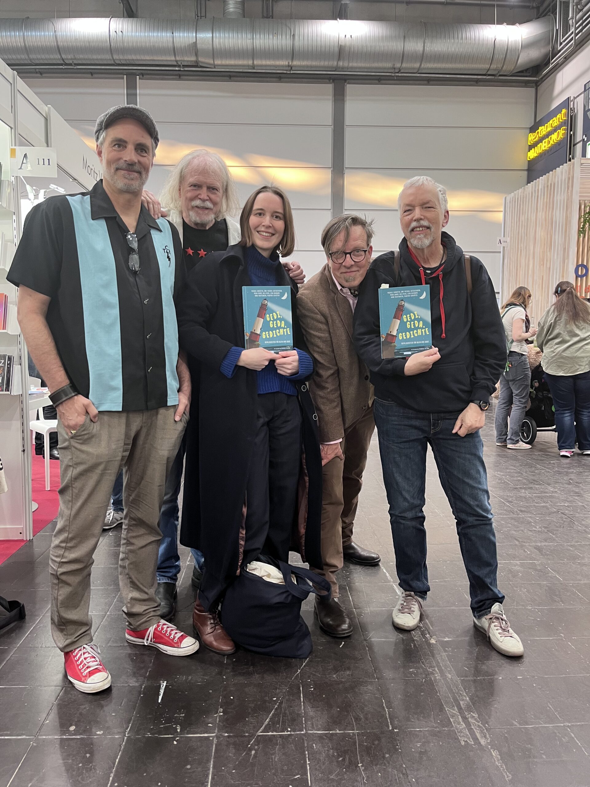Offiziell kommt das Buch erst am 8. April in die Läden, aber auf der Leipziger Buchmesse lagen am Atrium-Stand bereits Vorabexemplare von unserem Band „Gedi, Geda, Gedichte“ aus. Es ist das tolle Buch zum 100. Geburtstag des Kinderdichters James Krüss, das wir letztes Jahr auf Helgoland – wo Krüss geboren wurde – in einer Hummerbude am Hafen erdichtet haben. Dem Atrium Verlag war es noch in letzter Minute gelungen, einen Slot von einer halben Stunde auf der Messe zu ergattern und Michael Augustin und ich konnten in der Lesebude in Halle 3 dem interessierten Publikum erzählend und lesend einen ersten Einblick in unseren Gedichtband mit den phantastischen Bildern von Henrike Wilson geben – mit großem Erfolg. Und wie das auf Messen so ist, wo sich Hunderte Schriftsteller und Schriftstellerinnen umtun, kamen unsere Mitdichter Mona Harry, Nils Mohl und Arne Rautenberg vorbei und halfen uns kräftig feiern. Ein paar Einblicke in die Präsentation findet ihr HIER. Fotos und Videos hat Mona Sheikh vom Atrium Verlag gemacht. Tausend Dank!